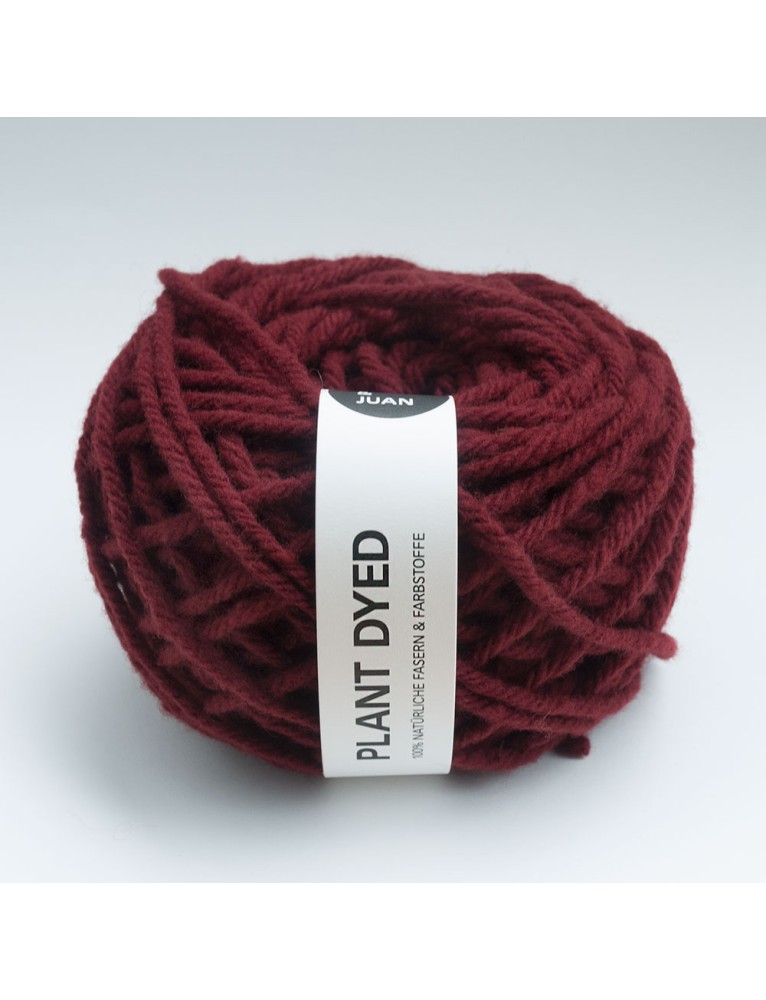Merino Wolle aus Spanien, mit einer Dicke von 6mm in der Farbe Bordeaux. Eine wertvoll pflanzlich gefärbte Wolle von dem jungen schweizer Label Anna & Juan.