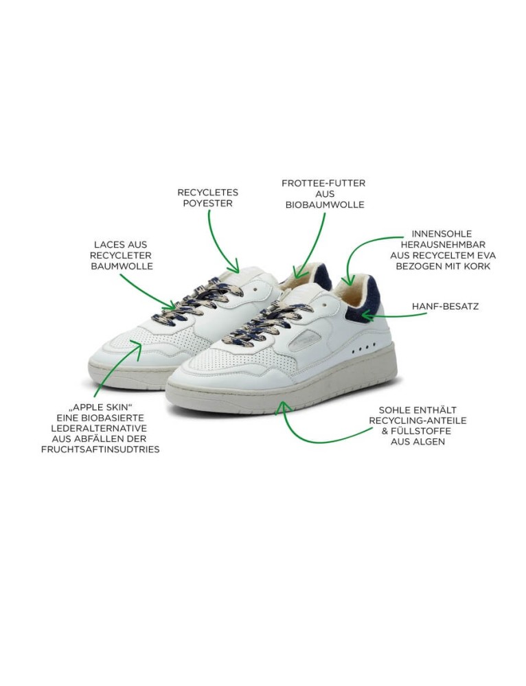 - Obermaterial: Apfel-Leder (auf Basis von Apfelresten) & Hanf